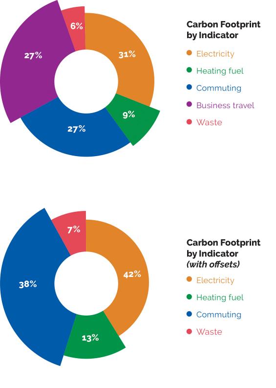 After business travel is removed from the calculations through offsets, our electricity use contributes 42 percent of our total carbon footprint. We purchase RECs and green power as a way of reducing the electricity we must use, while continuing to implement energy-conservation measures and efficiency improvements.