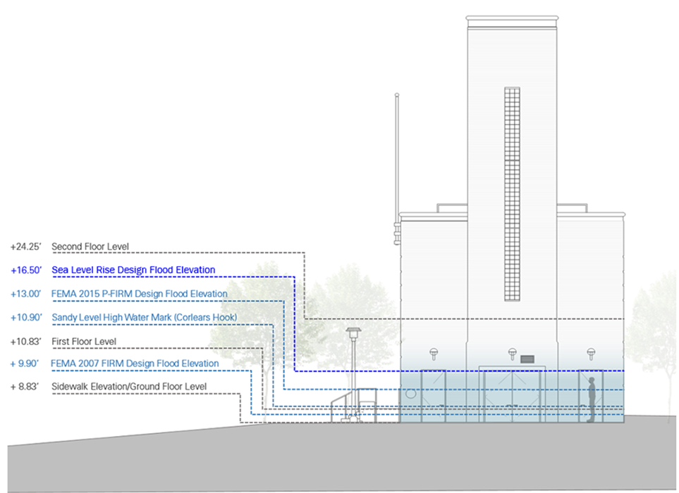 We conduct vulnerability assessments to better understand site exposure to specific hazards. For instance, forensic investigation and stormwater simulation and modeling were used for New York Hall of Science to determine stormwater points of entry during a flood event and to estimate the maximum probable flood depth on the site. This step takes the current and future hazard levels at the site into consideration and incorporates area-wide context to inform the development of appropriate resilience strategies.