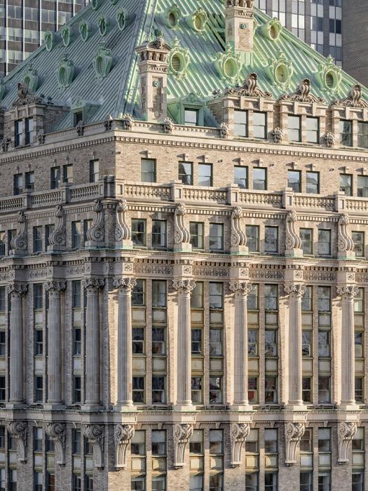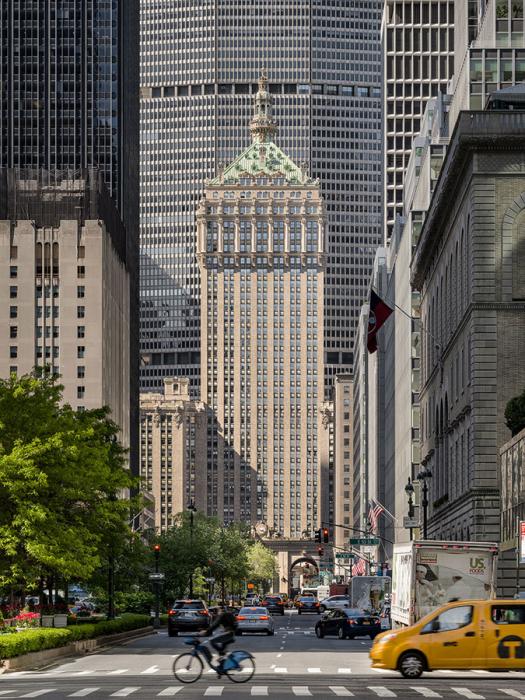 The Helmsley Building recently underwent a comprehensive façade restoration program from the cupola atop the crown to the vehicular portals at Park Avenue. Special challenges included restoring the iconic three-story columns at the 29th floor and six-foot-tall terra-cotta bison heads.