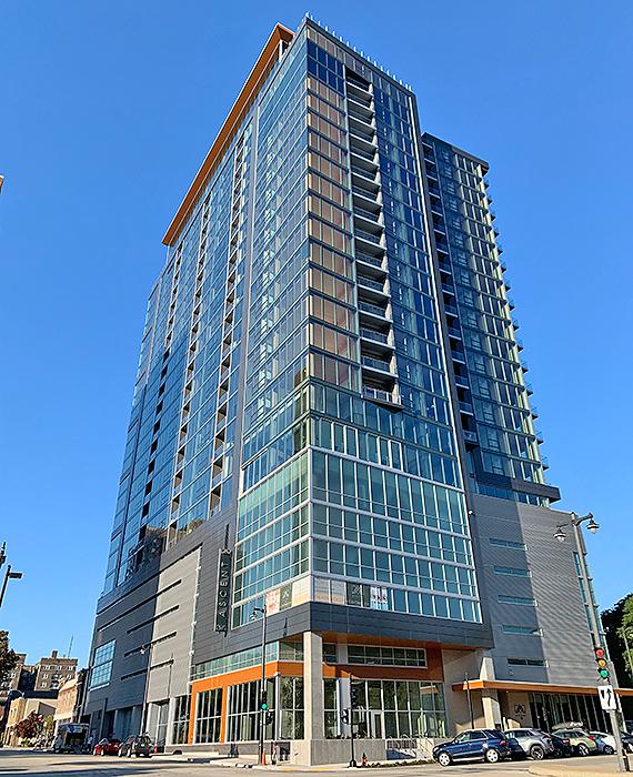 The Ascent, in Milwaukee’s East Town neighborhood, marked the tallest mass timber structure in the world. The 493,000-square-foot, 25-story mixed-use tower contains 259 apartments, a pool on the sixth floor and a penthouse amenity level.