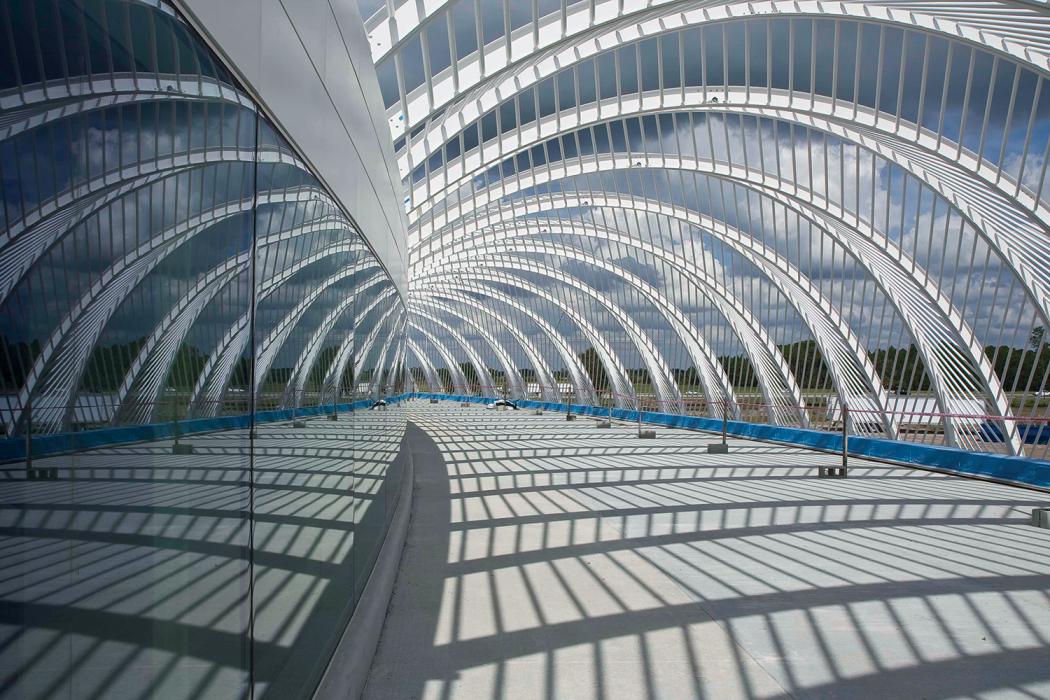 - The initial concept for the louvers called for two 250-foot-long movable arches to raise and lower the louvers. Working with the project team, the structural engineers developed an alternative in which individual hydraulic pistons operate each of the 94 louvers. This allowed for a lighter, less-expensive support structure and minimized the need for custom parts.