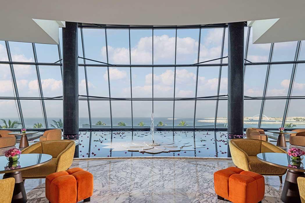 This waterfront luxury development includes the capitol city’s tallest residential tower, at 48 stories, connected by a dual sky bridge to a 29-story hotel. The exterior pool deck is located on the upper level of the sky bridge; the restaurants and lounge areas occupy the lower level.